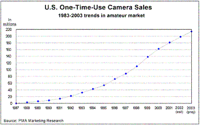 That sales in dollar terms are decreasing, but sales in unit terms are increasing, tells me that competition (and innovation) are very strong in this market. According to the source of the data, "Much of this [unit] growth is due to the approximately 9 percent of U.S. households that now use one-time-use cameras exclusively for all their picture-taking activity." Presumably they're also attracted by the decreasing prices... What I really want to know is why people use disposable cameras? Why is this such a large part of the overall photo market? For events such as weddings, where single-use cameras can be placed at each table, there seems to be no easy replacement. If a lot of usage is a matter of convenience, then I would say that the rent-a-camera market will not easily replaced even by cheaply-owned digital cameras. I think the data I need to resolve such questions is held in Chapter 4 of the 2003 US Consumer Photo Buying Report, but you have to be a member to the Photo Marketing Association to access it. Readers might also be interested in some history. According to this site: