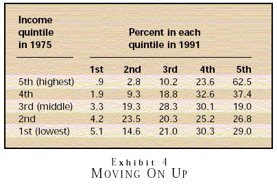 I do not dispute the accuracy of the data, but I do dispute Ben's interpretation. "Widening income inequality" has occured, but this doesn't demonstrate that "the rich" in the US (in this case, people with high incomes) have gotten richer (earning even higher incomes than before). The people in the top 5% of the income distribution in 1970 are not the same people in it today. More importantly, the overwhelming majority of those in the bottom bracket 30 years ago have moved up one or more income brackets in 30 years. Percentiles are not people. The only way to prove the assertion, "the rich are getting richer" is to look at the specific high income earners 30 years ago and follow their incomes into the future, and the only way to prove that "the poor are getting poorer" is to look at the specific people in the bottom 5% or bottom 20% of income earners 30 years ago, and follow thier incomes into the future. Only a longitudinal survey--like the Panel Study of Income Dynamics, conducted by the University of Michigan--can really answer whether the rich are getting richer. In fact, researchers have used the PSID to thoroughly document income dynamism--and have shown that overall, the rich got richer, but so did the poor. Who did this analysis? The same people who run the PSID, the Institute for Social Research at the University of Michigan. Their results are reported in By Our Own Bootstraps: Economic Opportunity & the Dynamics of Income Distribution by W. Michael Cox and Richard Alm--authors of Myths of Rich and Poor. Instead of reinventing the wheel, let me quote Cox and Alm's explanation of figure 4: