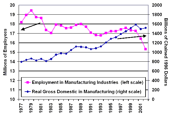 Those Manufacturing Jobs Many commentators have noted the continual loss of manufacturing jobs overseas (or lost forever to productivity gains). But as anybody who looks at the size composition of GDP knows, as the number employed in manufacturing has decreased, manufacturing output has steadily increases.