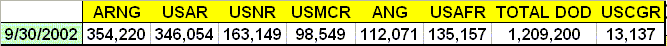 Also, the postal service employs about 800,000 workers--or thereabouts. UPDATE: Our military really is bigger than that--just more efficiently designed. The data above reflect active duty military only. Each reserve component is managed separately from the active component--and from each other. Still, active-reserve integration has been acclerating for some time. Table 5-2 of Selected Manpower Statistics FY2002 show data about the reserve components--which together yielded 1.2 million persons in 2002. Remember, most of these guys and gals are not full-time soldiers--or at least weren't until the recent military campaigns. Wal-Mart is still bigger than each component, but not all of them put together. An interesting question I'll try to answer is "how many reservists actually work at Wal-Mart?".