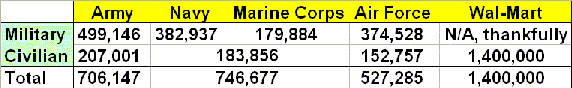 Big Government, Bigger Wal-Mart Last Sunday, Matthew Yglesias noted that the Federal Government, not Wal-Mart, is the largest employer in the US. True, but lumping together all federal employees in all departments really ignores how these bureaucracies are managed. For example, it's been my experience that the military services think of themselves as separate, distinct entities for the purposes of personnel management. The latest military and civilian stats (July 2003) indicate that Wal-Mart is in the lead: