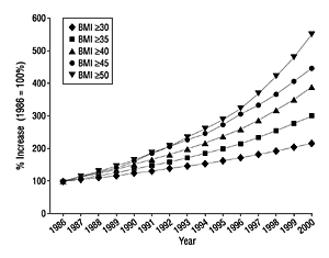 The last time I checked, even though the right to eat was not specifically mentioned n the constitution, neither was crafting and enforcing a mandatory "food policy." Also, renaming fatty-food regulation "environmental intervention" serves only to obscure its ferocious attack on American civil liberties; it is like calling China's one-child policy a friendly and necessary "family intervention." Choice of diet is no less important than the choice of family size. If somebody wants to eat grease all day, fine by me. If somebody wants to have 10 children, fine by me. Just don't expect me to feel bad if you die at 50, or cannot afford the best in medical care for all your children. I'd love to have a cheesburger and fries tonight, but I'll grill chicken instead. And personally I and my wife don't want a large family, but we do want 2 children. These are our choices to make--wisely or foolishly--nobody else's. However, there are real fiscal concerns with the morbidly obese. On May 1, 2002, before this blog was started, Rhonda L Rundle published an article entitled "Obesity's hidden costs" in the Wall Street Journal (reproduced here). It notes that rapidly increasing numbers of obese people will force hospitals to purchase capital equipment--bariatric wheelchairs, beds, mattresses, surgery tables, scales--to accomodate them. What the article doesn't say is that some of these charges will accrue to all hospital facility users--meaning the non-obese will pay for the obese. All these expenditures are, somewhat incorrectly, termed "social costs". In previous research Sturm conlcuded: